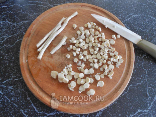 Корень хрена очистите и нарежьте тонкими кольцами или мелко натрите.