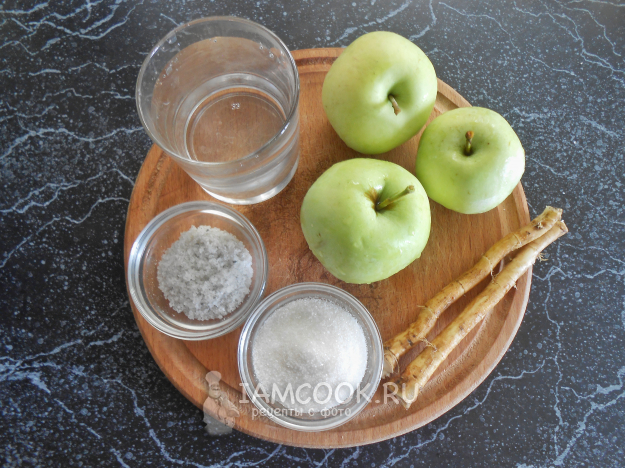 Возьмите все необходимые продукты для заготовки мочёных яблок с хреном. Берите яблоки спелые, хорошие, без синяков и без черных точек. Корень хрена используйте свежий.