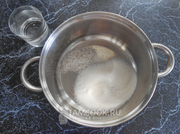 Приготовьте рассол. Смешайте воду, соль и сахарный песок.
