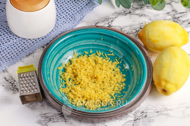 Лимоны выбирайте пахнущие, ароматные. Вскипятите воду в чайнике и ошпарьте цитрусы примерно 1 минуту, чтобы удалить воск с их поверхности. Затем протрите плоды бумажной салфеткой насухо. Натрите цедру с лимонов в глубокую емкость. Постарайтесь не натирать белый слой под ней, так как он может горчить.