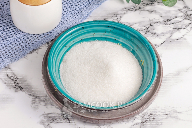 Всыпьте сахарный песок. На цедру с 2 лимонов вам вполне хватит 150 г сахара.