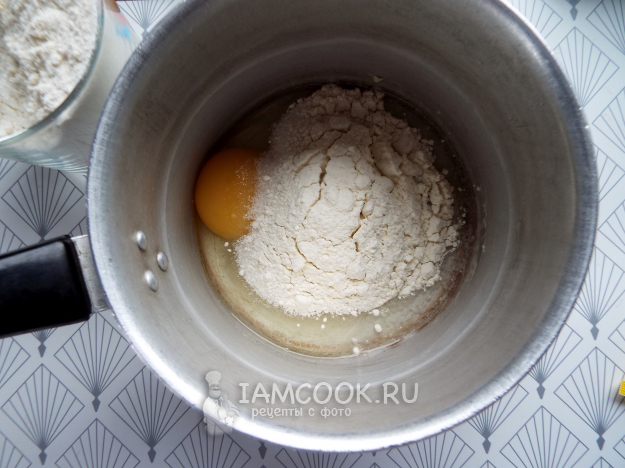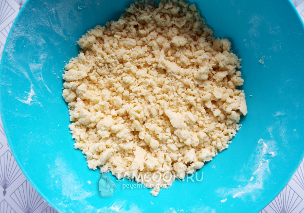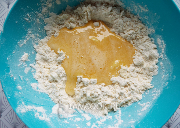 Перемешать в крошку. Добавить яйцо с сахаром, смешанные заранее.