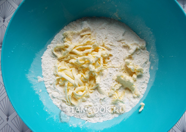 Муку, сахар и соль смешать в миске. Добавить натертое на тёрке холодное масло.