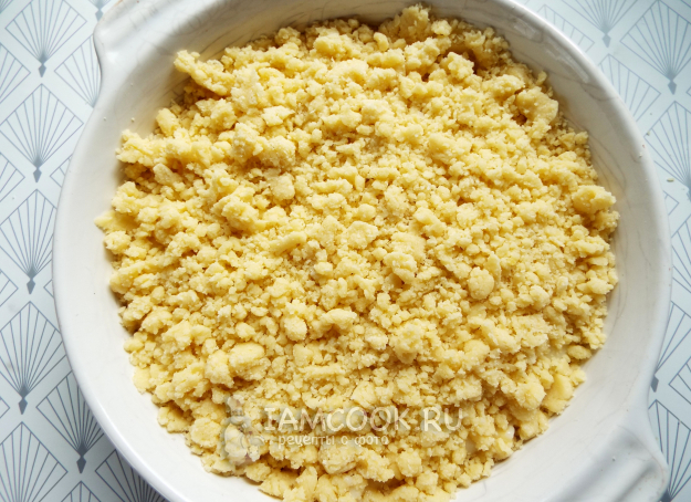 Всыпать в форму половину крошки, сделать небольшие бортики.