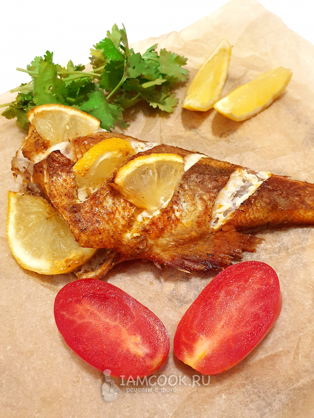 Запеките морского окуня с лимоном в духовке, разогретой до 200 градусов, в течение 20 минут и еще на 5 минут оставьте под грилем или при включенной конвекции. Конечно же, ориентируйтесь по своей духовке и ее режимам, важно получить сверху румяную корочку. Готовую рыбу можно дополнительно полить лимонным соком (по желанию).