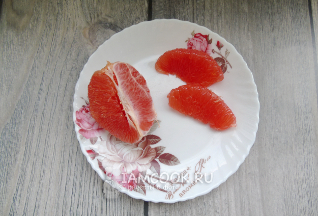 Цитрус помойте, обрежьте кожуру и разделите на дольки.