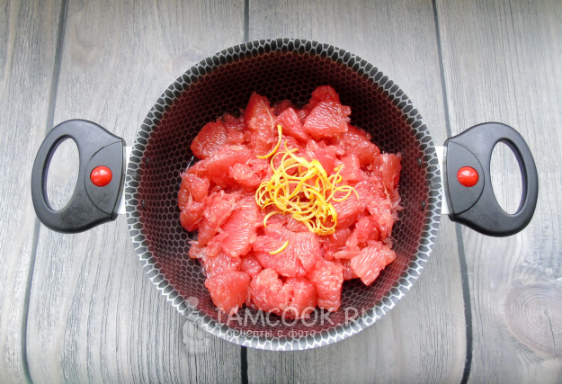 Выложите мякоть грейпфрута и цедру в кастрюлю с антипригарным покрытием или толстым дном.