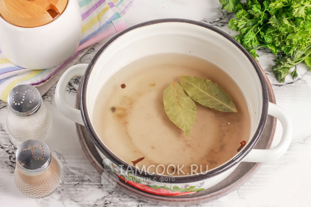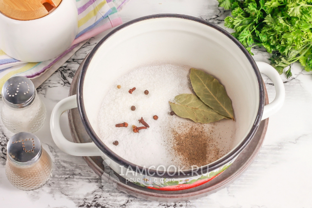 В кастрюлю или ковш всыпьте соль, сахар, гвоздику, молотый черный перец, лавровые листья и горошины черного перца. Можно добавить и другие специи или пряности по вкусу.
