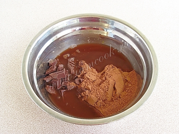 В миску положить поломанный на кусочки молочный шоколад, всыпать какао-порошок и влить воду.