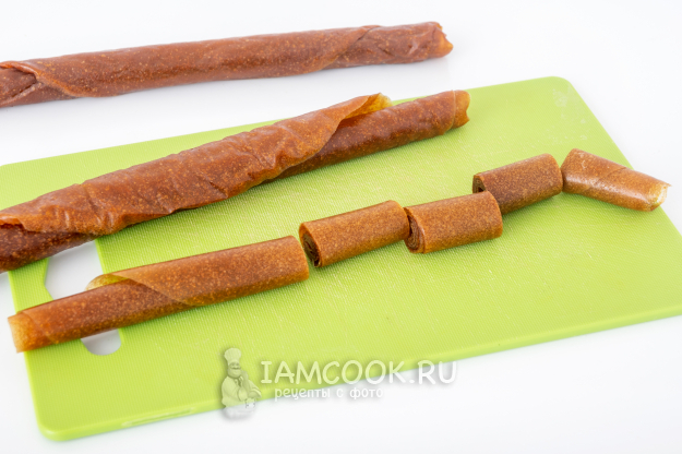 Пастилу можно свернуть в рулетик и нарезать на более мелкие рулетики. Либо другим удобным для вас способом.