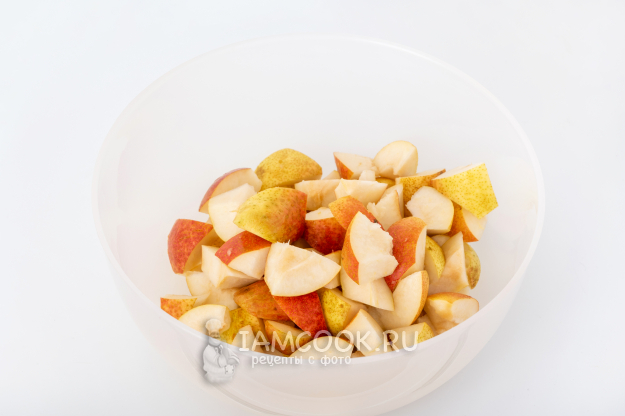 Груши помойте и очистите от семечек. Нарежьте на кусочки.