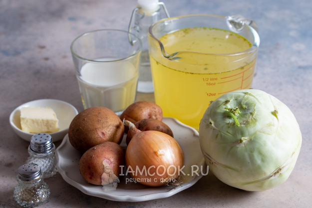 Подготовьте указанные ингредиенты для супа-пюре из кольраби. Овощи - среднего размера. Бульон можно взять любой, можно приготовить и просто на воде.