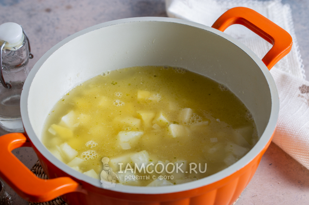 Влейте горячий бульон, доведите до кипения, убавьте нагрев чуть ниже среднего. Варите суп до мягкости капусты, около 20-25 минут. Попробуйте на соль, при необходимости добавьте.