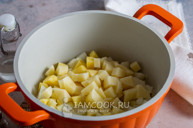 Картофель помойте и очистите. Порежьте крупным кубиком и добавьте в кастрюлю к овощам.