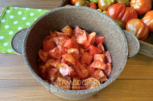 Нарежьте томаты на кусочки или пропустите через мясорубку. Выложите в кастрюлю с толстым дном и томите на среднем огне около 20 минут после закипания.