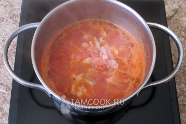 Бульон доведите до кипения, добавьте в него овощную массу. При следующем закипании отправьте кусочки рыбы.