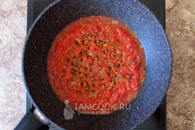 Затем отправьте к луку сочное пюре из помидоров, добавьте сухие итальянские травы (или травы на свой вкус). Потушите всё вместе при помешивании на среднем огне около пяти минут или до изменения цвета помидоров.