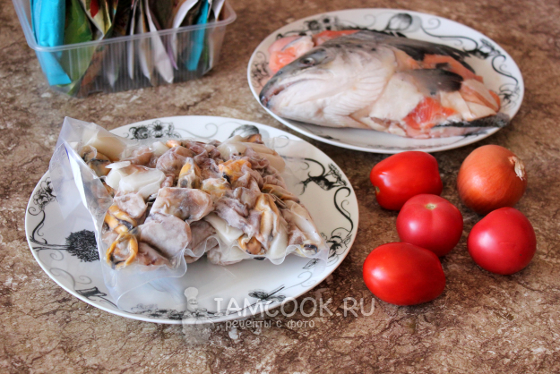 Замороженный морской коктейль (ассорти из мидий, кусочков кальмаров, осьминогов, каракатиц и т.д.) особенно вкусный, когда в нем есть креветки, но можно и без них – побюджетнее.