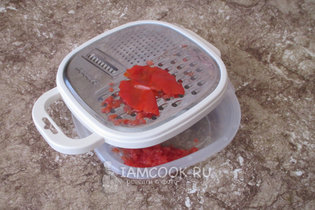 Помидоры для супа желательно очистить от кожуры. Мне нравится такой способ: помидор разрезается вдоль на две части и каждую половину остается просто натереть. Мякоть измельчится, а кожура останется в руке.