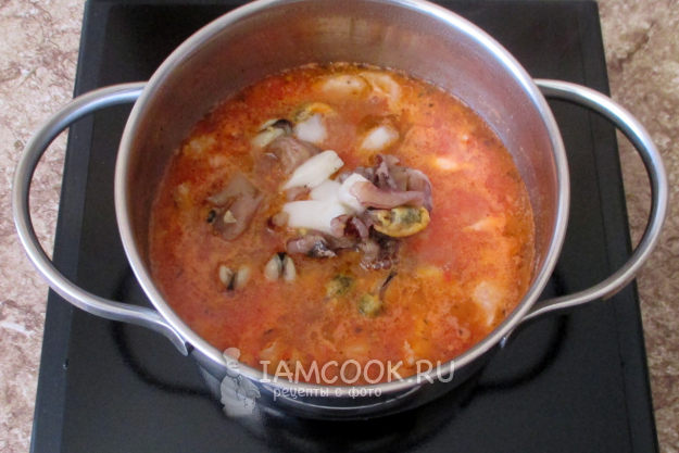 Когда закипит снова, наступает очередь ассорти из морепродуктов. Варите 2-3 минуты и снимите с огня. Досолите по вкусу.
