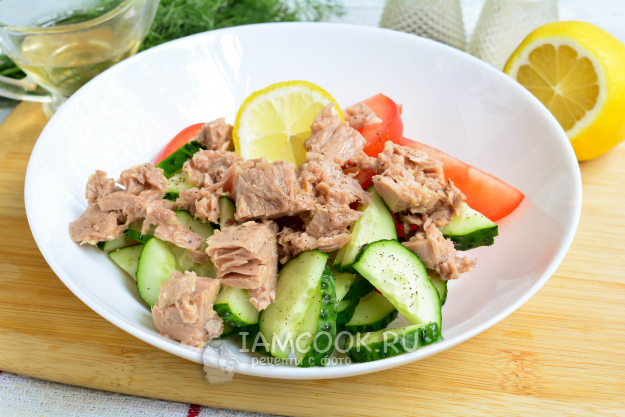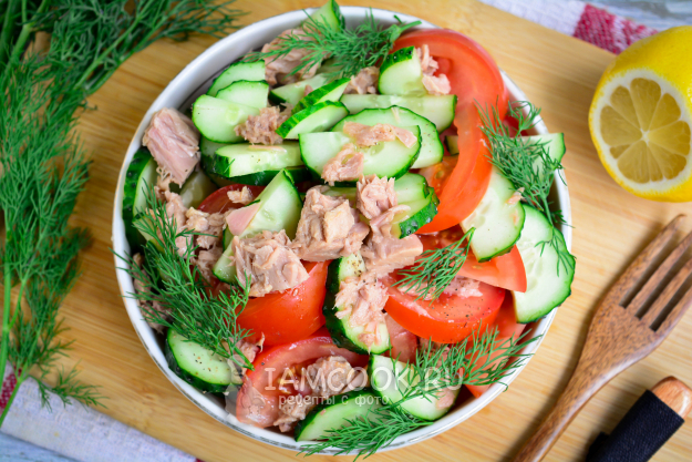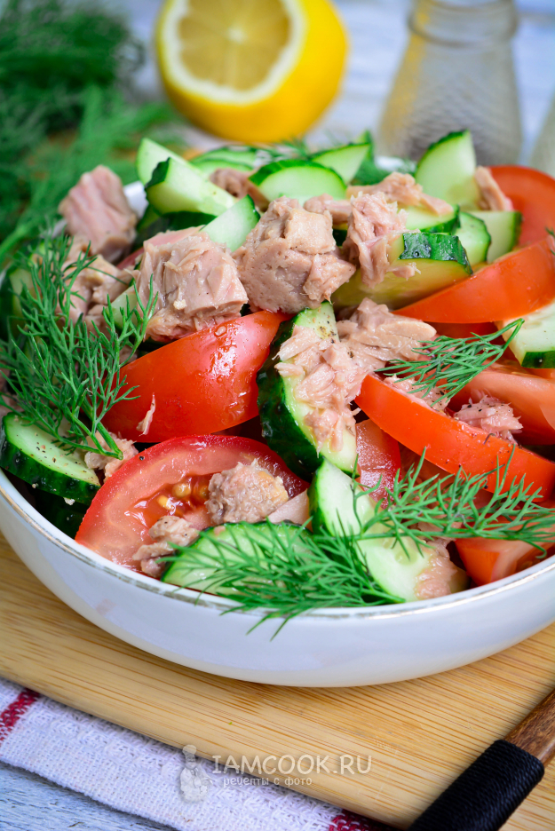 Салат с тунцом, помидорами и огурцами имеет насыщенный вкус и яркий вид. Подавайте его как закуску или дополнение к любому гарниру.