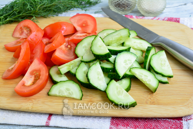 Овощи сполосните, удалите хвостики и плодоножки. Нарежьте средними дольками помидоры, полукольцами огурцы.