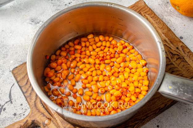 Подготовленную облепиху выложите в сотейник, добавьте чистую, бутилированную воду и сахар, доведите до кипения и проварите 10 минут.