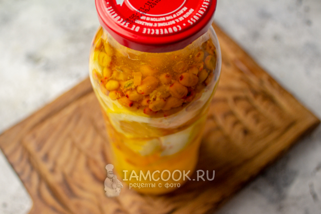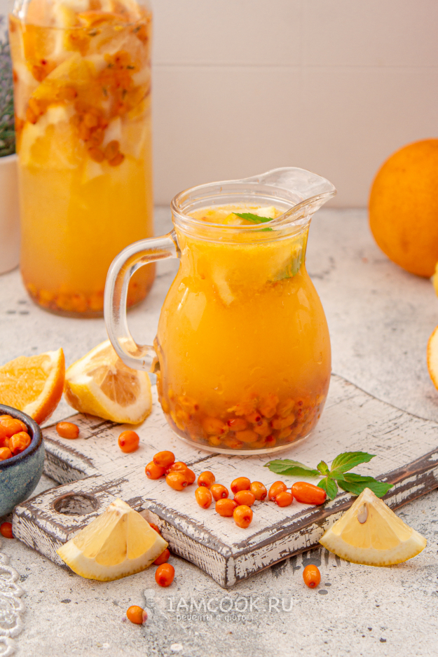 Подходящую емкость наполните ломтиками апельсина и лимона, залейте облепихой с сиропом и долейте доверху минеральной водой. Закройте плотно крышкой, слегка взболтайте и уберите в холодильник на пару часов.
