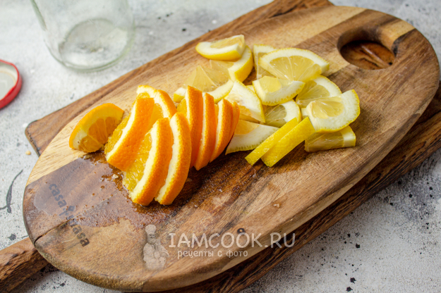 Апельсин и лимон промойте и нарежьте на тонкие ломтики.