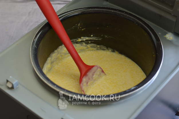 Всыпьте кукурузную крупу. Сразу добавьте соль и сахар.