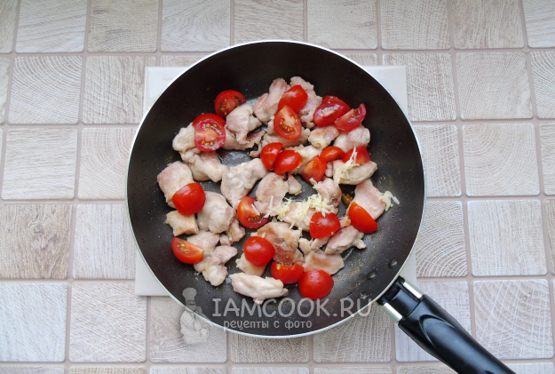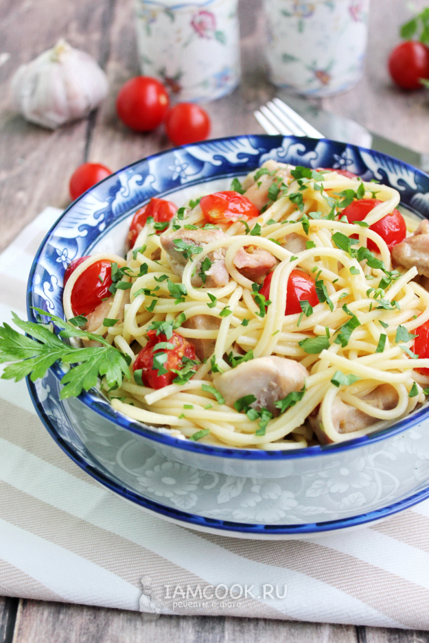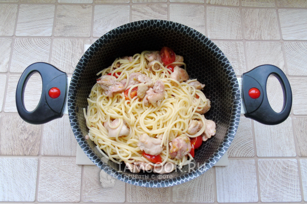 Добавьте к спагетти жареную курицу с помидорами черри и чесноком, перемешайте.
