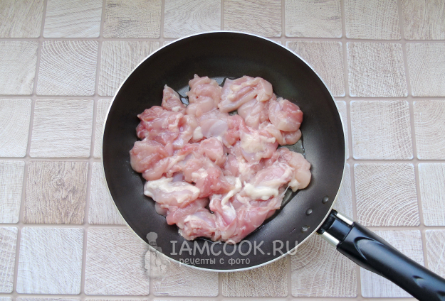Любое куриное филе (у меня - филе бедер) помойте, нарежьте небольшими кусочками и выложите на горячую сковороду с растительным маслом.