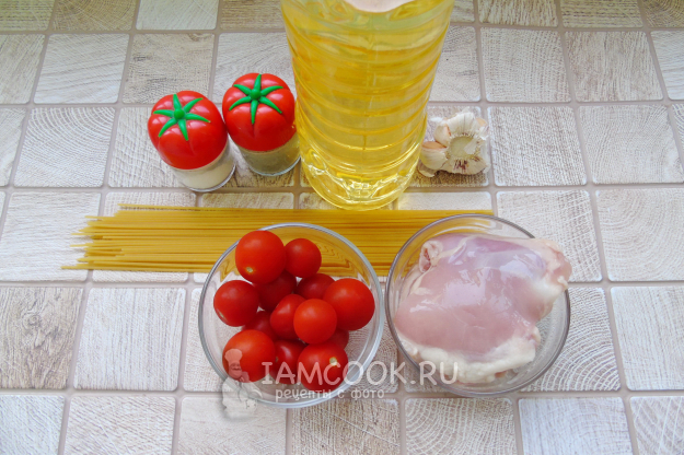 Для приготовления спагетти с курицей и помидорами черри возьмите ингредиенты, представленные на фото.