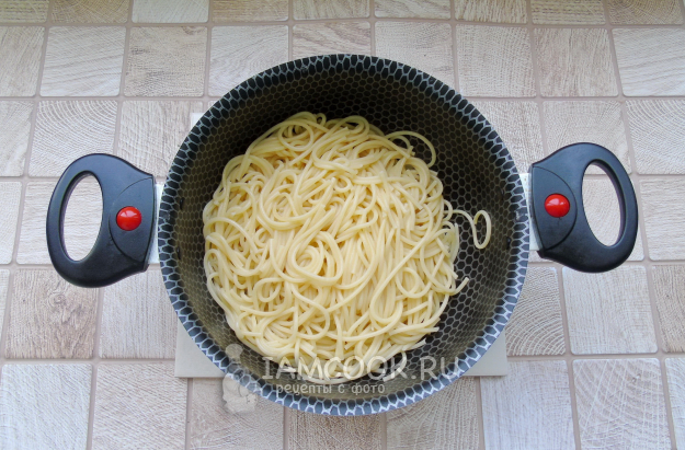 Пока курица жарится, налейте в кастрюлю воду, посолите по вкусу и доведите до кипения. Выложите в кастрюлю спагетти и варите до готовности по инструкции на упаковке. После воду слейте.