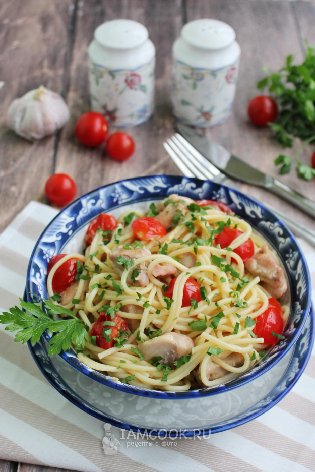 Спагетти с курицей и помидорами черри готовы. Подавайте к столу в горячем виде.