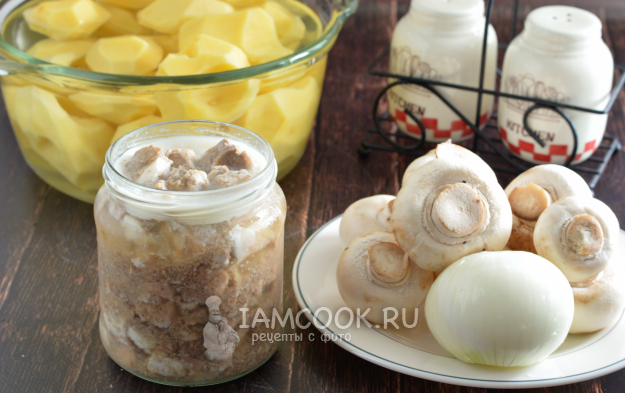 Возьмите всё необходимое для приготовления тушеной картошки с тушенкой и грибами.