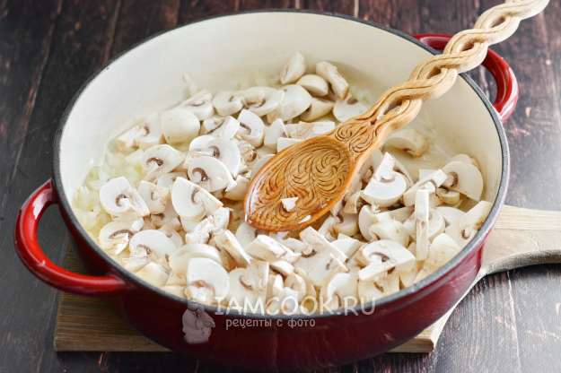 После чего добавьте нарезанные шампиньоны и поджарьте их немного вместе с луком.