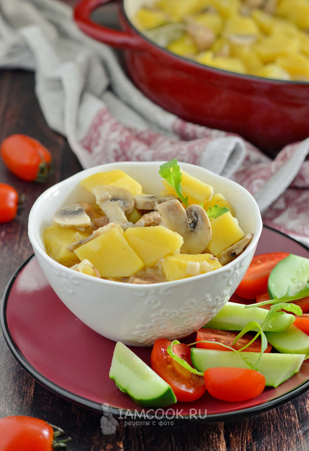 Тушеная картошка с тушенкой и грибами готова! Подайте к ней овощной салат, нарезанные свежие овощи или домашние соленья.