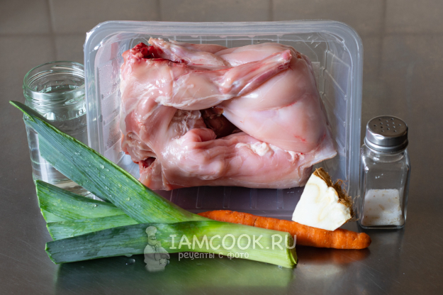 Приготовим ингредиенты для бульона из кролика: мясо должно иметь комнатную температуру, овощи - тщательно вымыты.