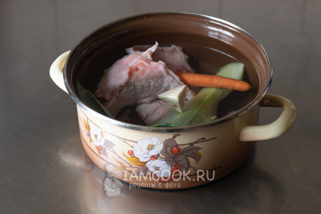 Помещаем мясо в кастрюлю вместе с ароматическим букетом. Полностью заливаем водой.