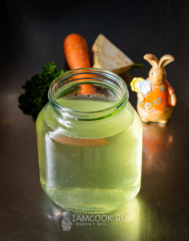 Ну, вот и наш готовый бульон. Как видите, его отличает высокая прозрачность и абсолютно минимальное количество жира (буквально пара пузырьков!). Солят бульон готовым.
