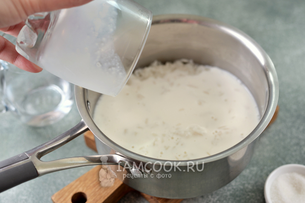 Влейте жирные сливки, продолжайте варить еще минуты 3 на тихом огне. После добавления сливок кашу нужно постоянно помешивать, чтобы не пригорела.