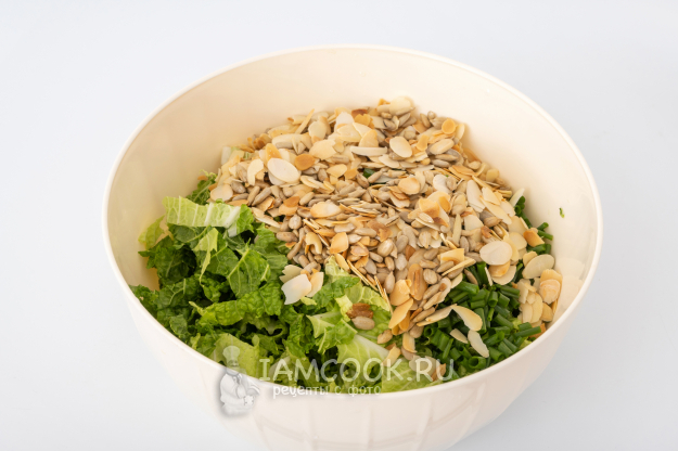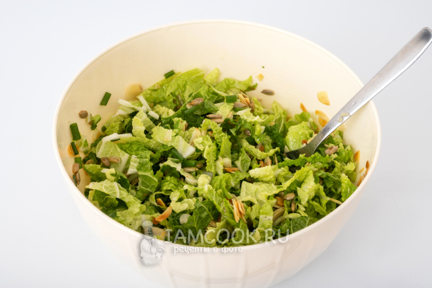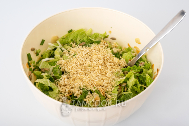 Не открывая пакет, пожмякайте вермишель, чтобы измельчить её. А затем добавьте салат и снова перемешайте. После чего сразу же подавайте салат на стол. Если же вы салат планируете есть не сразу, то очень рекомендую орешки с семечками и вермишель добавлять перед самой подачей, так как они размокнут и не будут так приятно хрустеть. Да и салат уже станет не таким интересным.