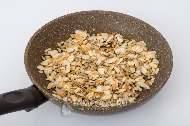 В первую очередь нужно слегка обжарить миндальные лепестки с семечками. Для этого положите их на сухую горячую сковороду и жарьте до приятного лёгкого подрумянивания. Главное, не спалить. После чего выложите их в какую-то ёмкость и пусть немного остынут, пока мы будем занимать другими ингредиентами.