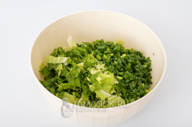 Листья пекинской капусты и лук хорошенько промойте и обсушите, чтобы убрать лишнюю влагу. В миске соедините нарезанные на полосочки листья пекинки (только зелёная часть) и измельчённый зелёный лук.