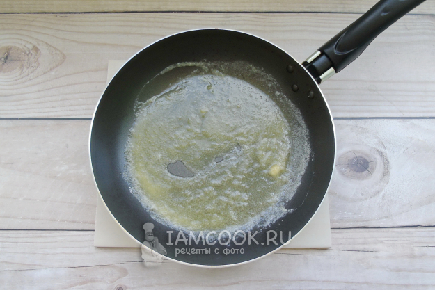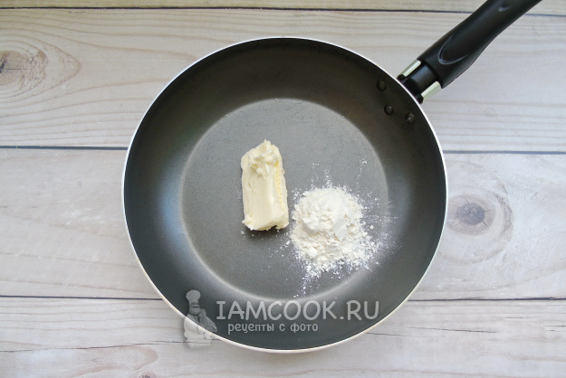 Пока фрикадельки варятся, приготовьте соус "Бешамель". В сковороду насыпьте муку и выложите сливочное масло.