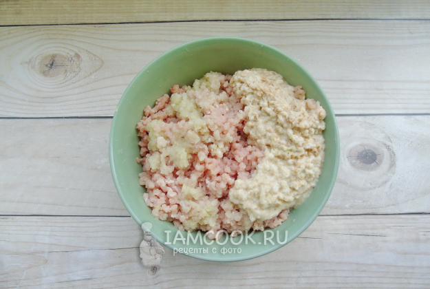 Белый батон или булку залейте холодной кипяченой водой и через несколько минут отожмите от воды. Лук очистите и помойте. Филе индейки помойте. Пропустите эти ингредиенты через мясорубку.