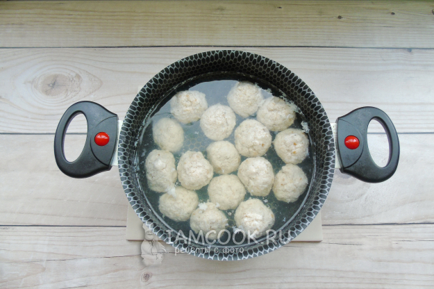 В кастрюле доведите воду до кипения и выложите в неё фрикадельки. Варите с момента закипания 20-25 минут.