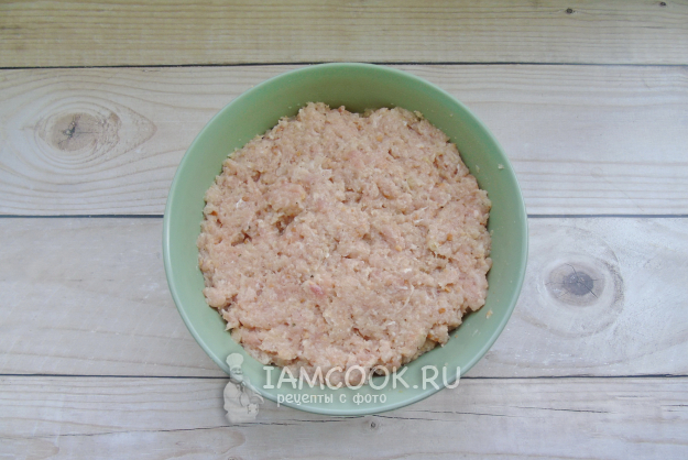 Посолите и поперчите по вкусу, тщательно перемешайте. Для большей однородности можно взбить фарш блендером.