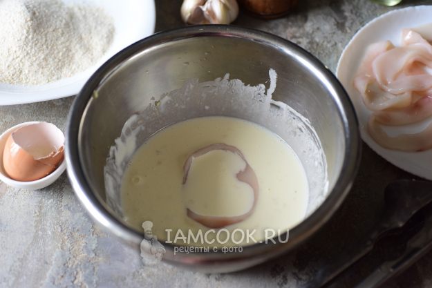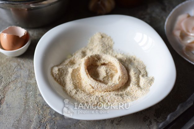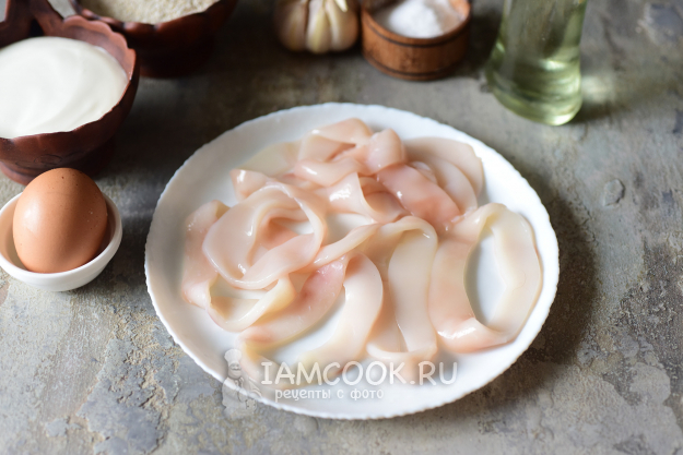 Будем сначала окунать каждое кольцо кальмара в сметанную смесь.